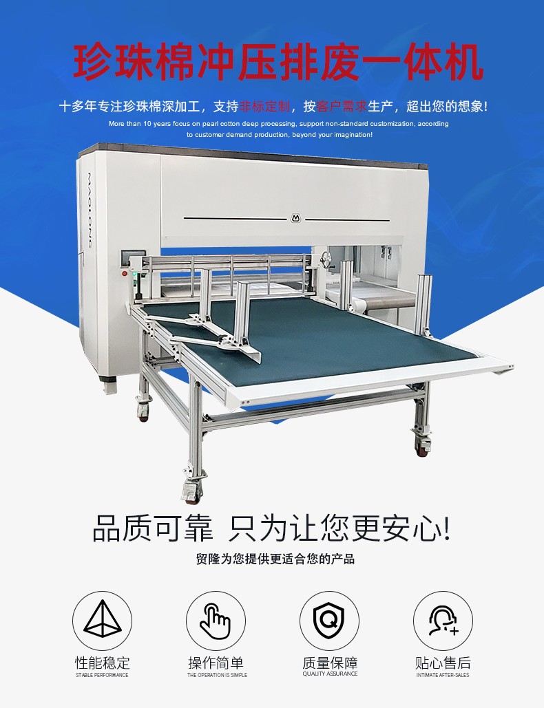 珍珠棉冲裁排废一体机 产品简介 突出优势 工作原理 技术参数 应用物料 在线留言 珍珠棉冲裁排废一体机 产品简介: 主要用于厚的珍珠棉的一次冲压成型排废 应用范围:珍珠棉冲裁一体机 物 料:珍珠棉粘冲裁 设备咨询 索取报价 突出优势 1.珍珠棉冲裁一体机一次冲压成型排废,省掉二次人工排废;2.280mm高的材料不变形。 工作原理 一次性可稳定多块材料一次冲压;冲压速度和厚度可电脑自动调节;速度快,切割面没有弧度。 技术参数 应用物料 珍珠棉加工 纸板切割 eva切割机材料 在线留言 * 您的称呼: *联系电话: 使用地区: 请选择 北京市 上海市 天津市 重庆市 河北省 山西省 内蒙古自治区 辽宁省 吉林省 黑龙江省 江苏省 浙江省 安徽省 福建省 江西省 山东省 河南省 湖北省 湖南省 广东省 广西壮族自治区 海南省 四川省 贵州省 云南省 西藏自治区 陕西省 甘肃省 宁夏回族自治区 青海省 新疆维吾尔族自治区 香港特别行政区 澳门特别行政区 台湾省 其它 市: 请选择 产品类别: 请选择 珍珠棉切割设备 珍珠棉粘合设备 珍珠棉开槽设备 涂胶设备 其它 产品型号: 请选择 电子邮箱: 简单描述: